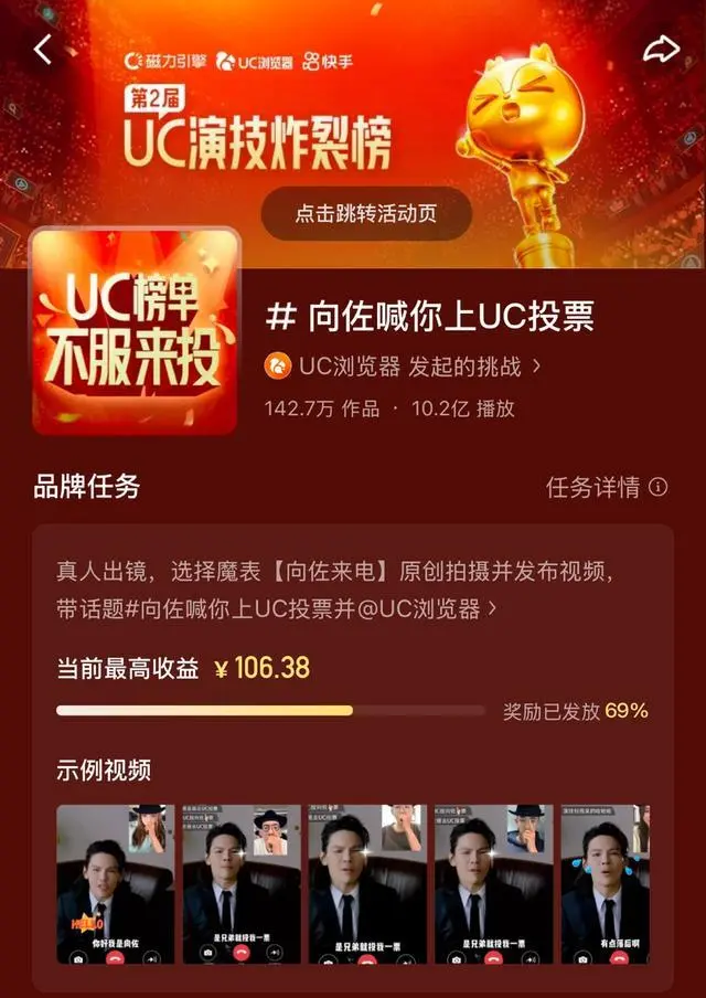 在网友的热情互动和积极应援下,快手#向佐喊你上UC投票活动截至1月12日已有142w+作品,播放量高达10.2亿,UC浏览器“演技炸裂榜”目前也已经有近200万人次参与投票。